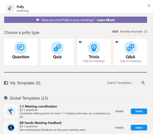 - The authoring window will display a selection of options, including the use of templates. SelectingQuestion will take you to the window for creating a new polly, with the full list of options and settings.